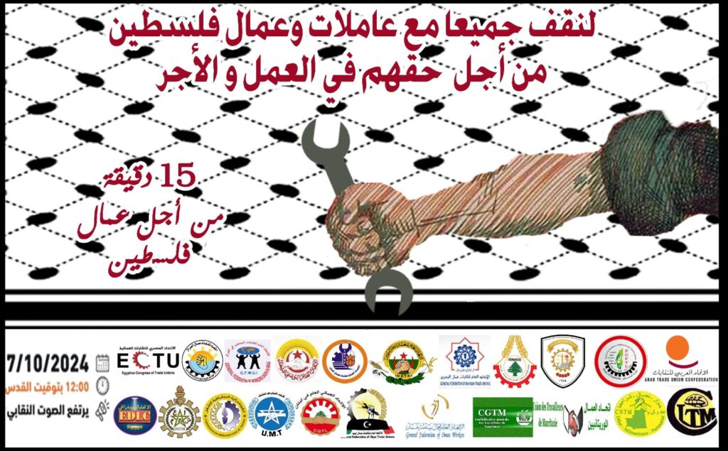 استجابت عشرات الاتحادات والنقابات العمالية الدولية والعربية إلى نداء الاتحاد العام لنقابات عمال فلسطين الذي دعا به إلى إضراب عمالي عالمي في السابع من أكتوبر المصادف لذكرى اليوم العالمي للعمل اللائق .