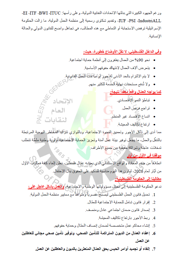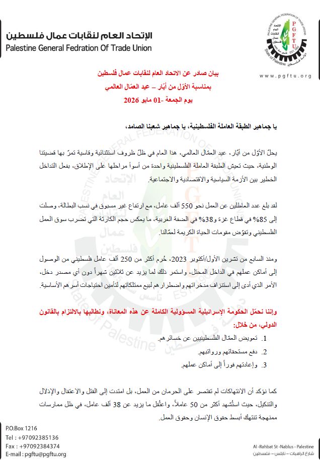 انطلاقاً من حجم المعاناة والواقع الاستثنائي الذي يعيشه عمّال فلسطين، نعلن إلغاء كافة فعاليات الأوّل من أيّار لعام 2026، ليكون هذا اليوم مناسبة للتأكيد على الحقوق بدل الاحتفال.