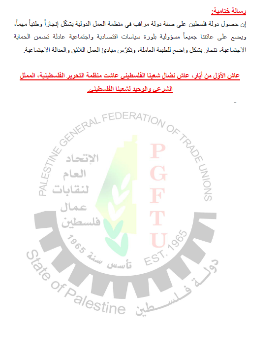 إن حصول دولة فلسطين على صفة دولة مراقب في منظمة العمل الدولية يشكّل إنجازاً وطنياً مهماً، ويضع على عاتقنا جميعاً مسؤولية بلورة سياسات اقتصادية واجتماعية عادلة تضمن الحماية الاجتماعية، تنحاز بشكل واضح للطبقة العاملة، وتكرّس مبادئ العمل اللائق والعدالة الاجتماعية.