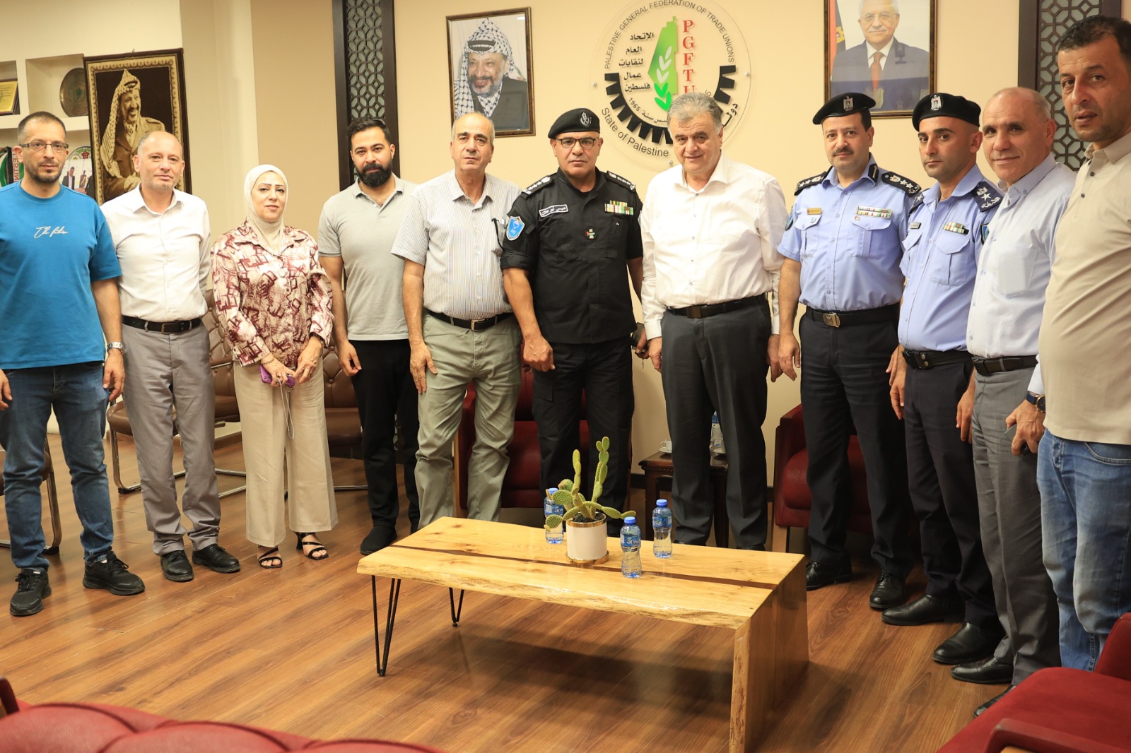 2025/07/28 – نابلس – زار وفد من شرطة محافظة نابلس يرأسه مدير شرطة محافظه نابلس العميد حقوقي عيسى أبو علان ، لمقر الاتحاد العام لنقابات عمال فلسطين في نابلس، حيث كان في استقبالهم الأمين العام لإتحاد النقابات العمال شاهر سعد وعدد من أعضاء الاتحاد.