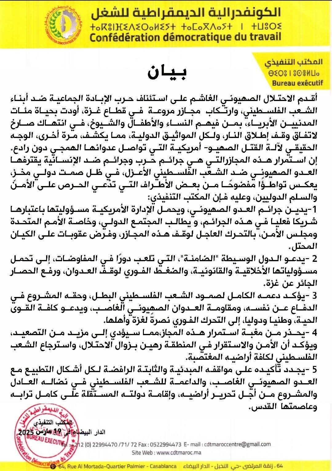 نددت الكونفدرالية الديمقراطية للشغل استئناف حرب الإبادة الجماعية ضد الشعب الفلسطيني، وارتكاب مجازر مروعة في قطاع غزة أودت بحياة مئات المدنيين الأبرياء بمن فيهم النساء والأطفال والشيوخ.