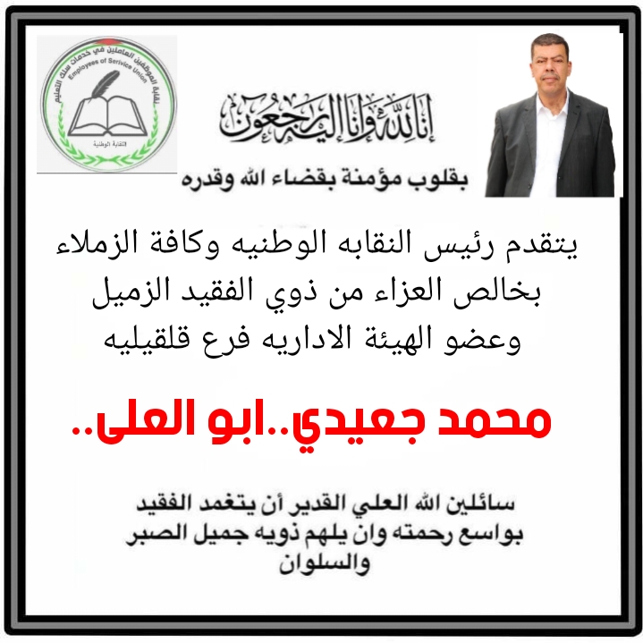 قلقيلية- شاهر سعد الأمين العام للاتحاد العام لنقابات عمال فلسطين، وأعضاء الأمانة العامة، واللجنة التنفيذية، وأمناء سر الفروع، ورؤساء النقابات، ورؤساء الدوائر يشاطرون آل جعيدي في قلقيلية عامة أحزانهم لوفاة المرحوم والمغفور له بإذن الله