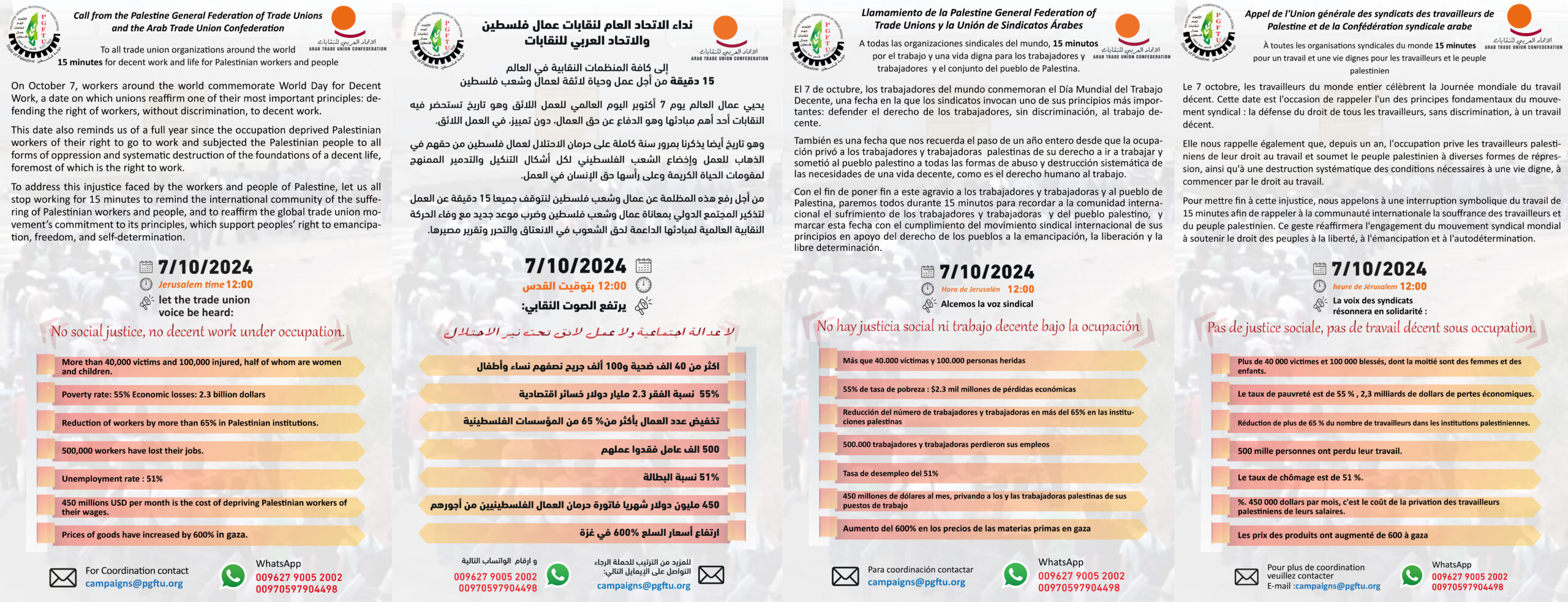 نداء الاتحاد العام لنقابات عمال فلسطين والاتحاد العربي للنقابات باللغات العربية، والإنجليزية، والفرنسية، والإسبانية