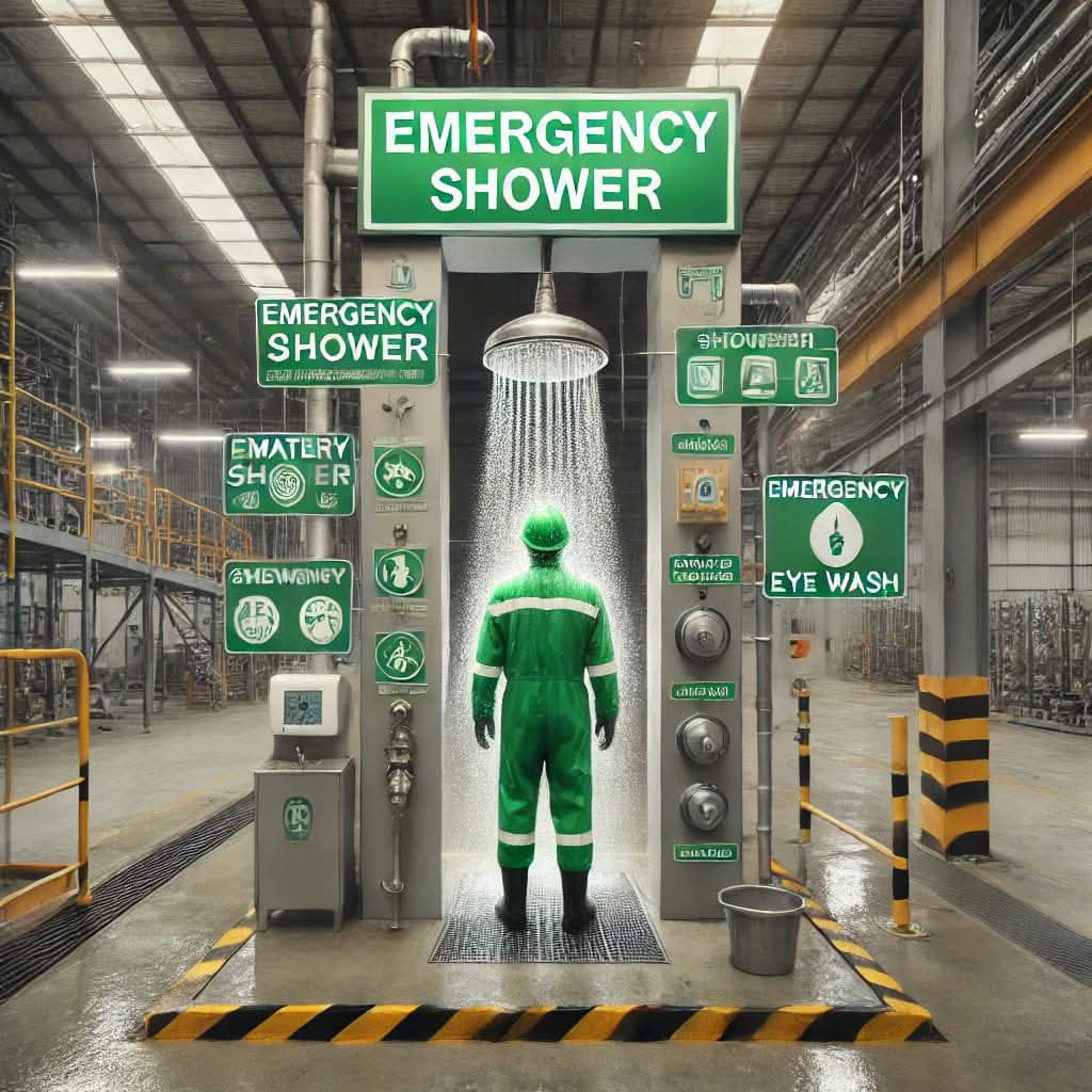 علامات خضراء توضح موقع الدش واستخدامه، مثل “Emergency Shower” و”Emergency Eye Wash”.