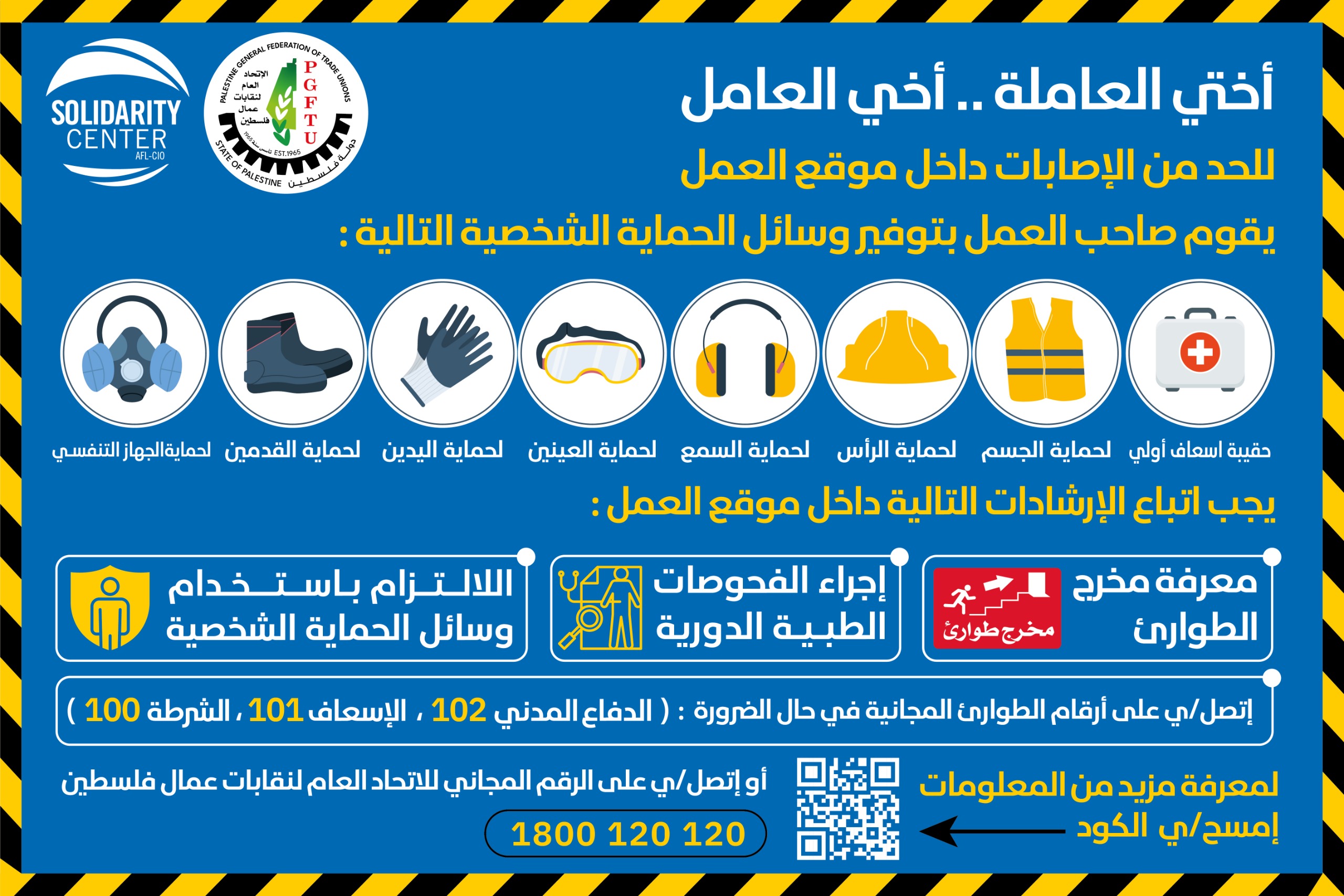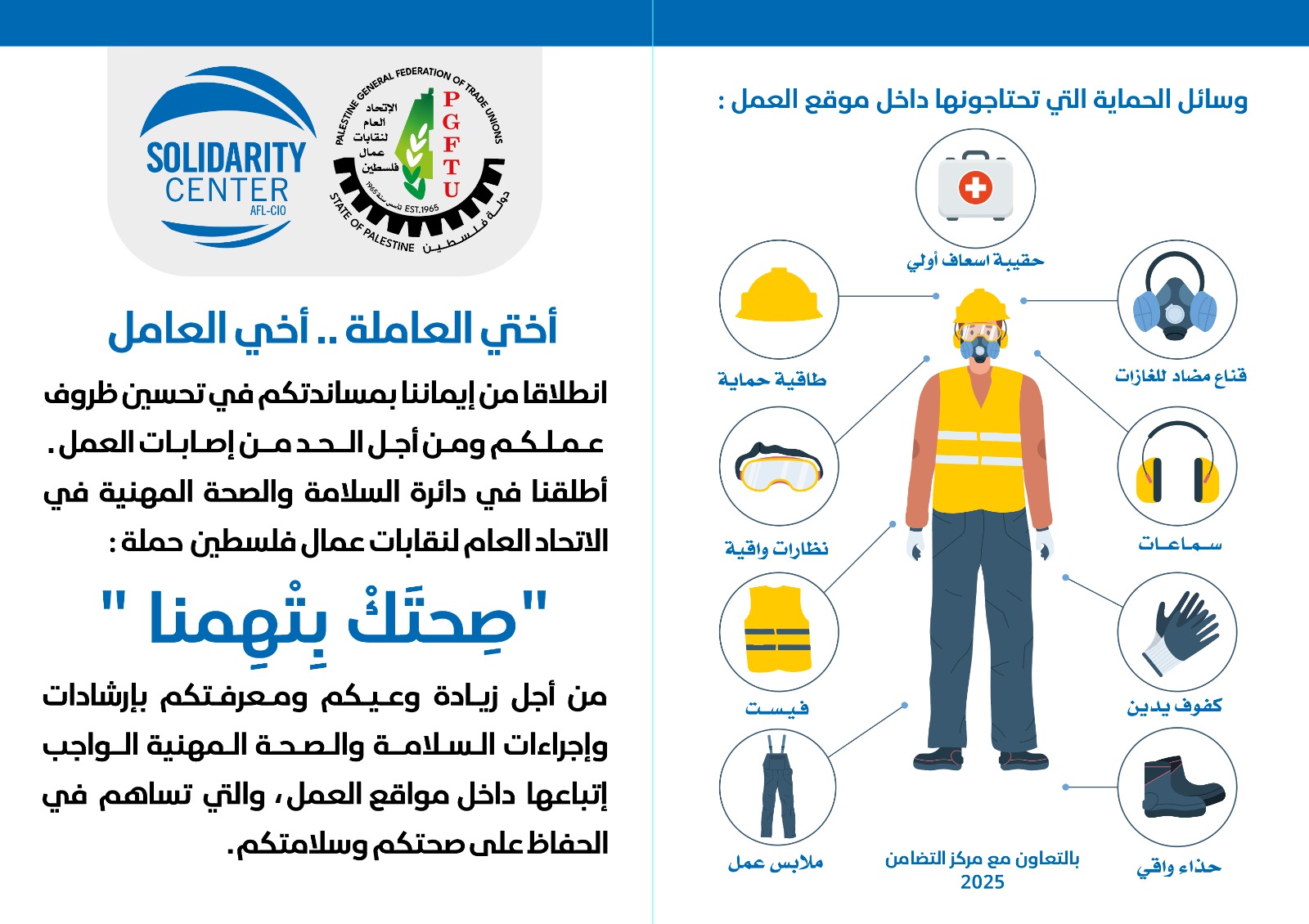 دائرة الصحة والسلامة المهنية أحد الدوائر التابعة للاتحاد العام لنقابات عمال فلسطين والتي تهتم بالتوعية والتثقيف للعمال والعاملات في سوق العمل حول أهمية الالتزام بمعايير الصحة والسلامة المهنية خلال فترة عملهم داخل المنشئات والمصانع والشركات، وايضا داخل البنايات قيد الإنشاء، أو حتى بمختلف المهن التي قد يتعرض لها العامل لمخاطر الإصابة أو الوفاة.