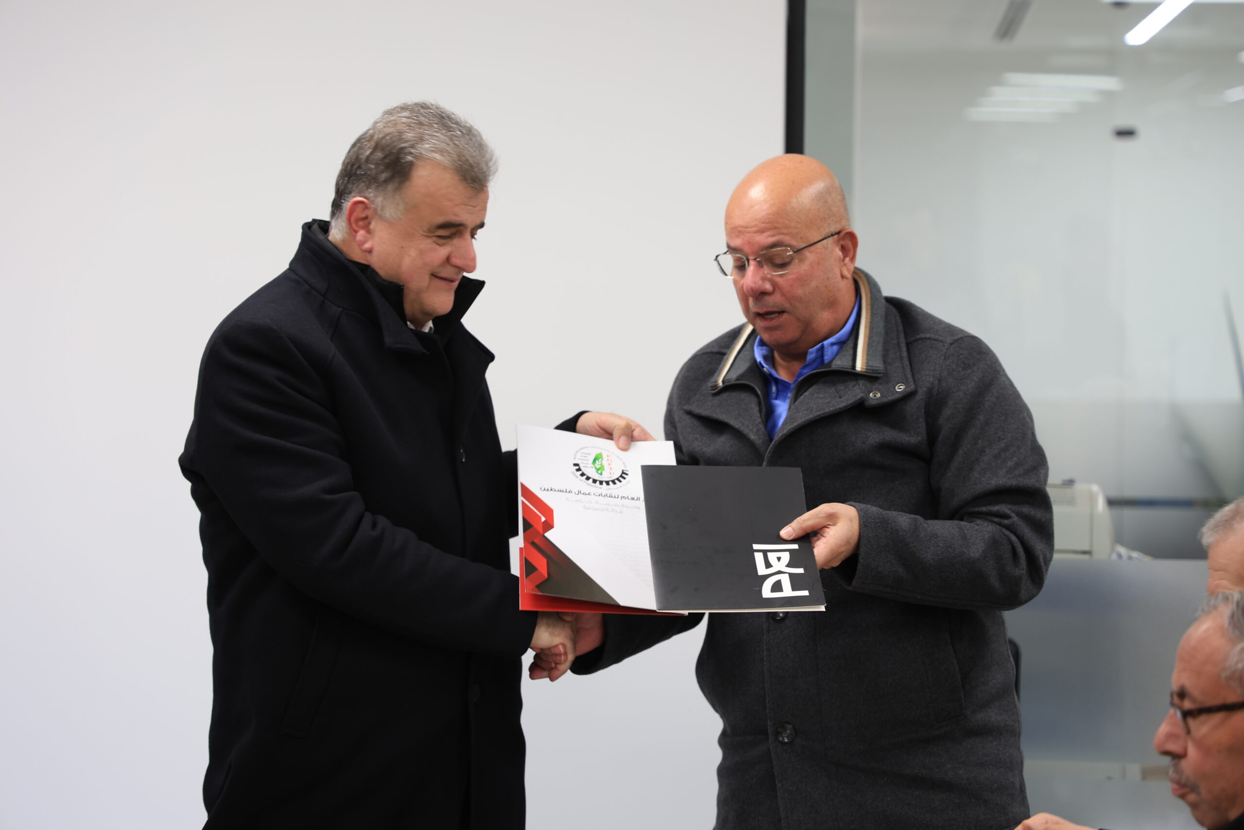 وقع اليوم الاتحاد العام لنقابات عمال فلسطين والاتحاد العام للصناعات الفلسطينية مذكرة تفاهم من أجل العمل المشترك على تطوير وتوطيد علاقات العمل بين أصحاب العمل والعمال داخل المنشآت والمؤسسات الصناعية، بهدف تطوير وتنمية الصناعات الفلسطينية، وصولاً الى تحقيق الأهداف التنموية المستدامة للاقتصاد الوطني ورفع مستوى معيشة للمواطن الفلسطيني.