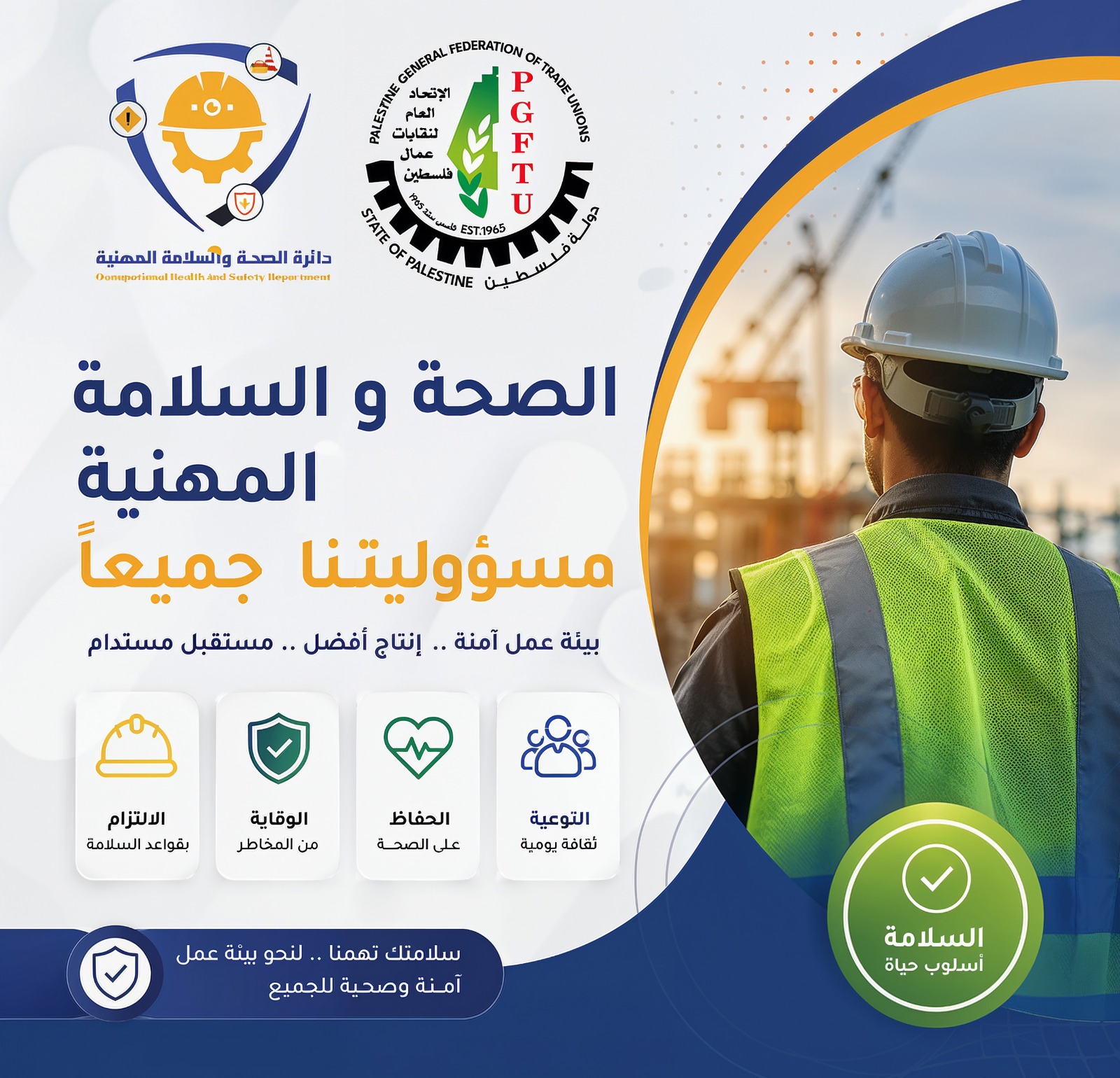 The Occupational Safety and Health Department at the Palestinian General Federation of Trade Unions has reaffirmed its firm commitment to defending workers’ right to a safe and healthy work environment, stressing that this right is “fundamental and non-negotiable.” The statement was issued on the occasion of the World Day for Safety and Health at Work.